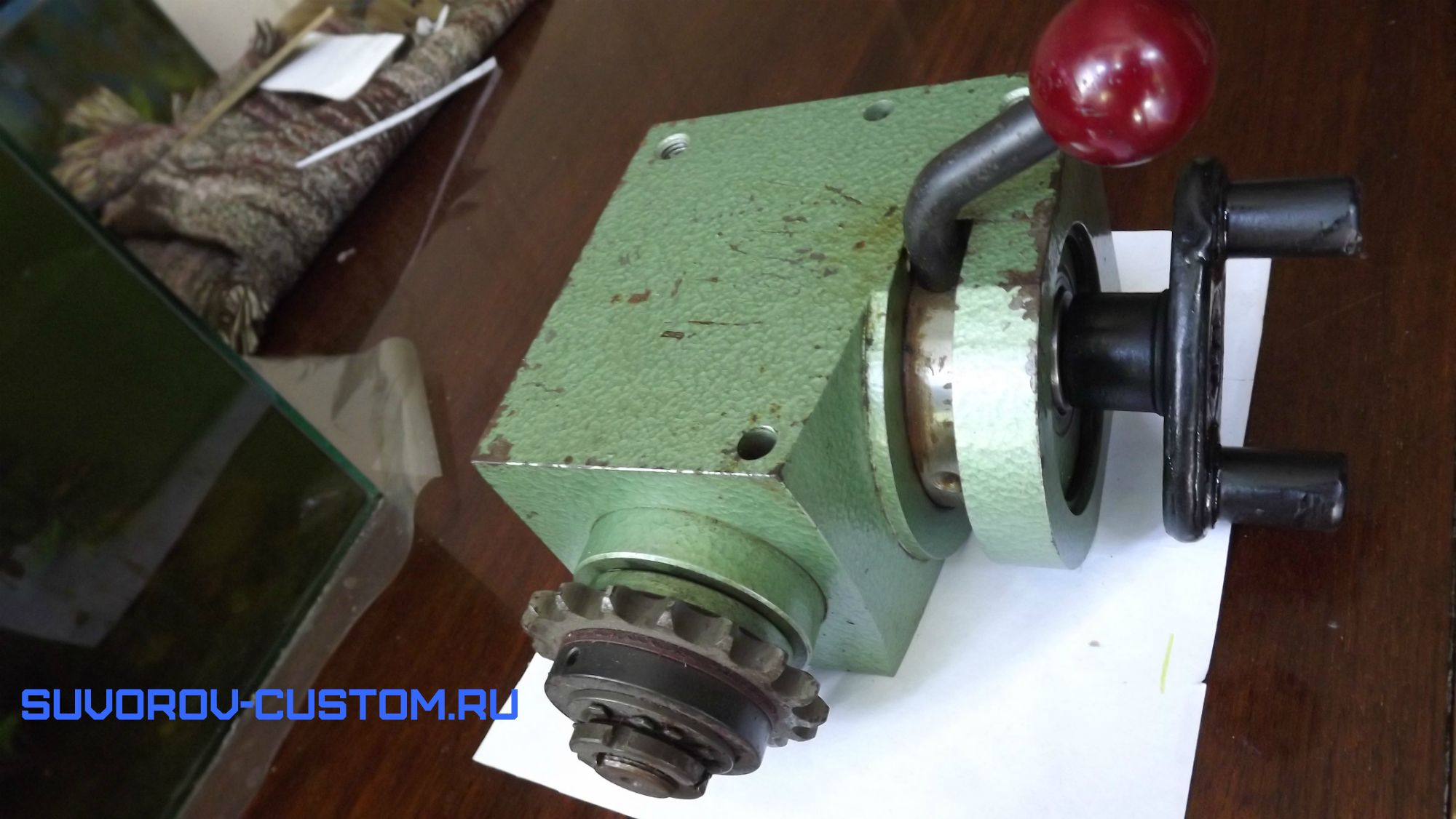 На фото показан заводской двухскоростной(с рычагом переключения) угловой редуктор от немецкого станка, который мне посчасливилось купить. Но обычный односкоростной редуктор можно изготовить из куска швеллера подходящей ширины.
