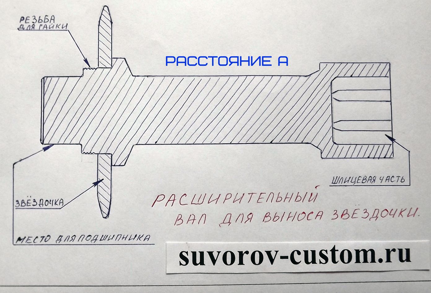 Основная задача стоящая перед кастомайзером после расширения рамы, как сдвинуть в сторону цепь, но оставить на месте двигатель — строго по центру? Ведь стоит сместить мотор немного вправо или влево от центральной оси мотоцикла, то сместится и центр тяжести и тогда нормальной управляемости и устойчивости аппарата вы не добьётесь. Есть два варианта : установить блок промежуточных звёздочек или вывести в сторону ведущую звёздочку с помощью выточенной ступицы переходника. Первый вариант более сложен и не привлекателен на мой взгляд по функциональности. Поэтому остановимся на втором, как более практичном и более простом.